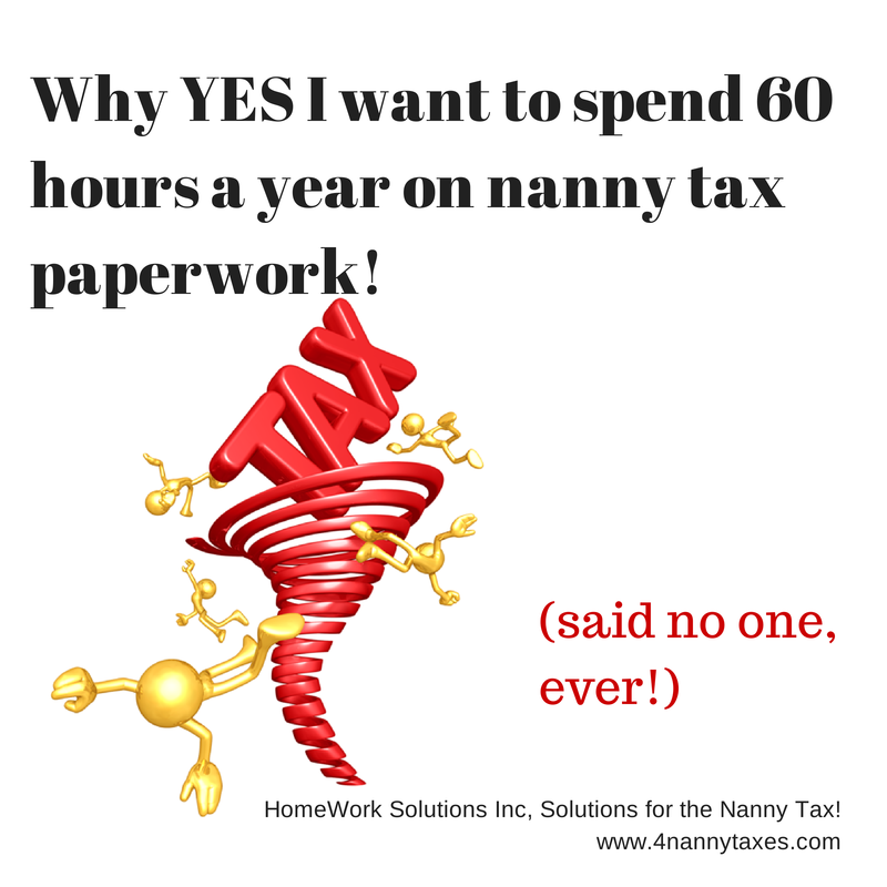 How much time an individual would spend on their nanny taxes will of course vary between individuals. The IRS estimates that record-keeping, keeping familiar with the law, and tax return completion can run 60 hours per year. Record-keeping accounts for the lions share of the time, an activity that needs to be done every payroll period.